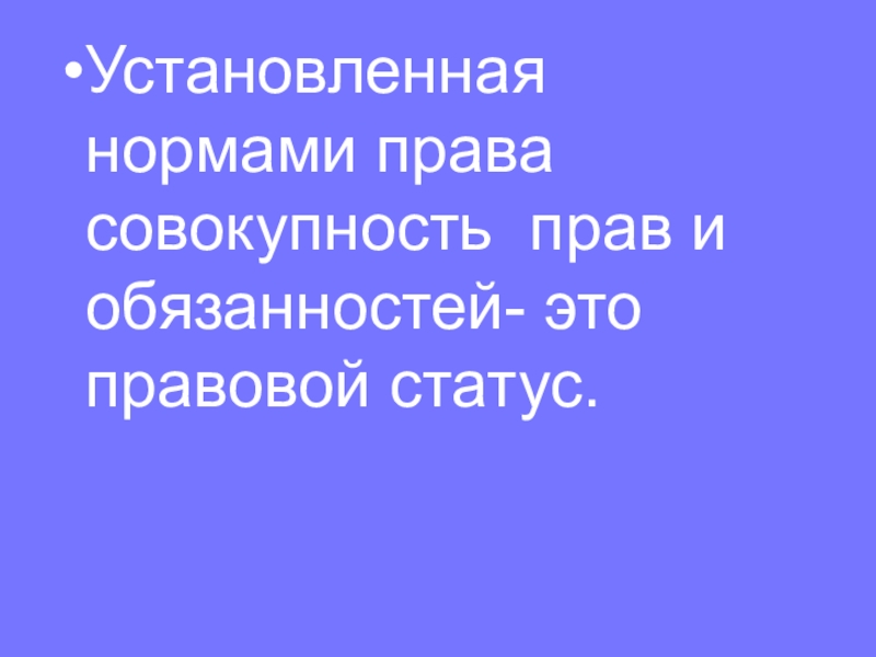 Слайд 3Установленная нормами права совокупность прав и обязанностей- это правовой статус.