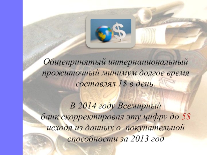 Слайд 6Общепринятый интернациональный прожиточный минимум долгое время составлял 1$ в день.