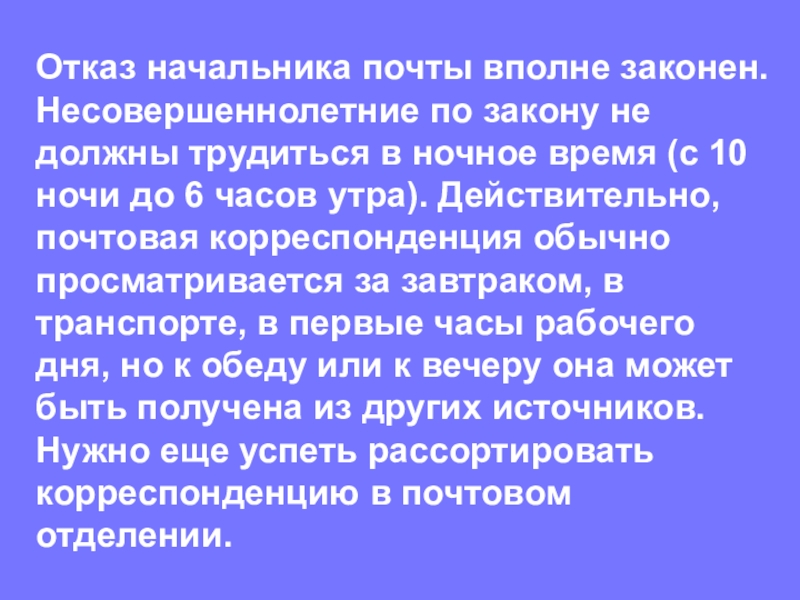 Слайд 47Отказ начальника почты вполне законен. Несовершеннолетние по закону не должны трудиться