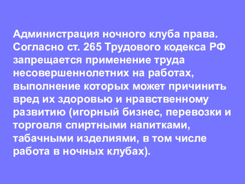 Слайд 45Администрация ночного клуба права. Согласно ст. 265 Трудового кодекса РФ запрещается