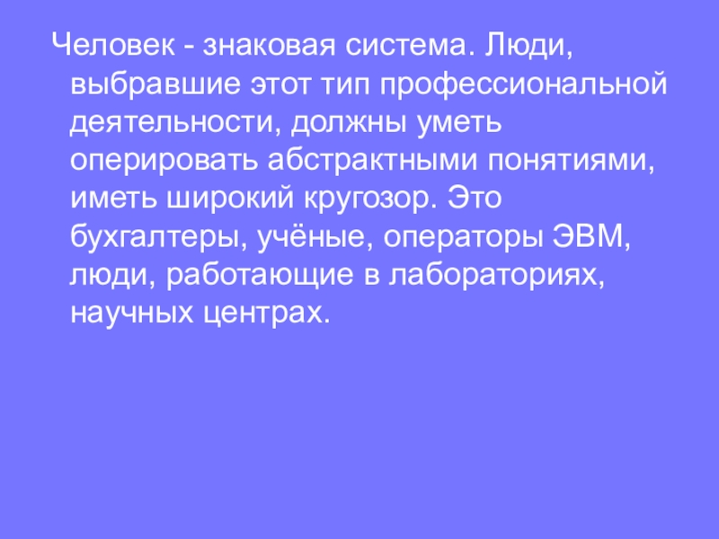 Слайд 34 Человек - знаковая система. Люди, выбравшие этот тип профессиональной деятельности,
