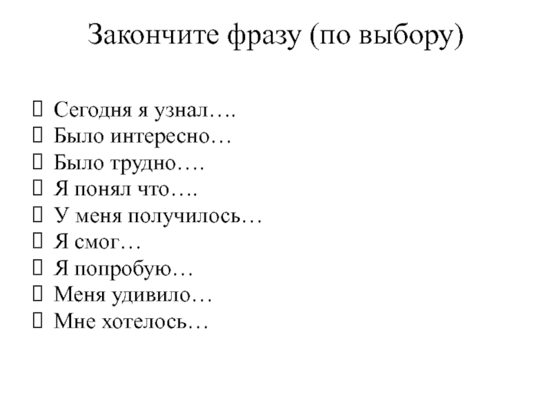 Закончите фразу (по выбору) Сегодня я узнал….Было интересно…Было трудно….Я понял что….У меня получилось…Я смог…Я попробую…Меня удивило…Мне хотелось…