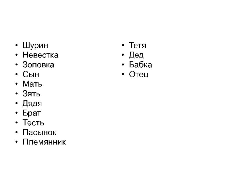 ШуринНевесткаЗоловкаСынМатьЗятьДядяБратТестьПасынокПлемянникТетяДедБабкаОтец