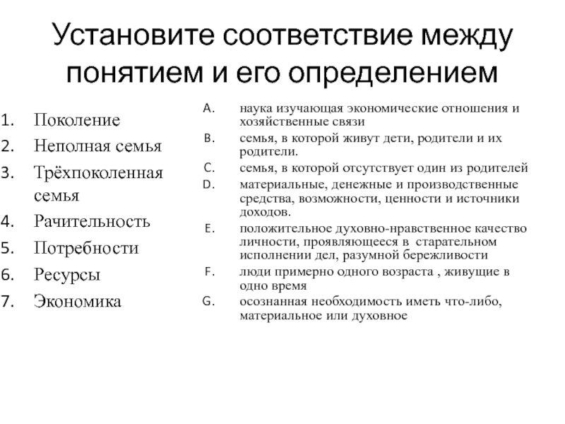 Установите соответствие между понятием и его определениемПоколениеНеполная семьяТрёхпоколенная семьяРачительностьПотребностиРесурсыЭкономиканаука изучающая экономические отношения и хозяйственные связисемья, в которой