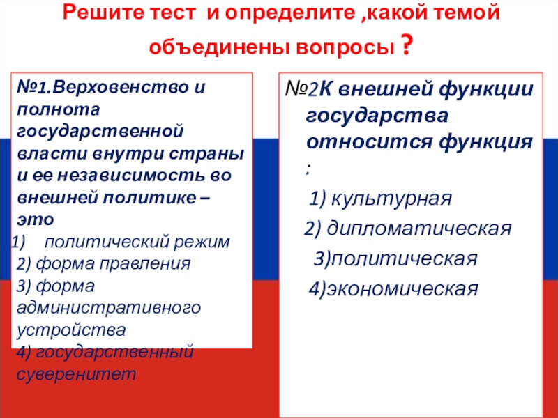№1.Верховенство и полнота государственной власти внутри страны и ее независимость во внешней политике – это