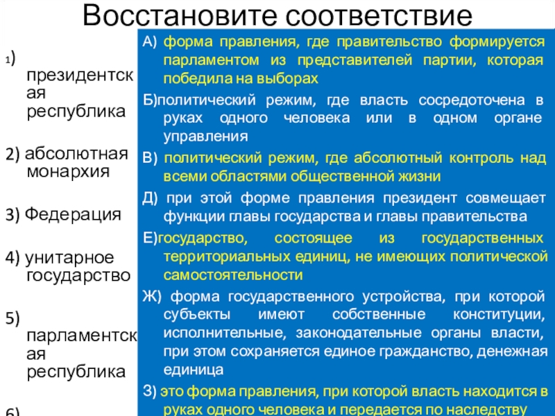Ж) форма государственного устройства, при которой субъекты имеют собственные конституции, исполнительные, законодательные органы власти, при этом сохраняется единое гражданство, денежная единица