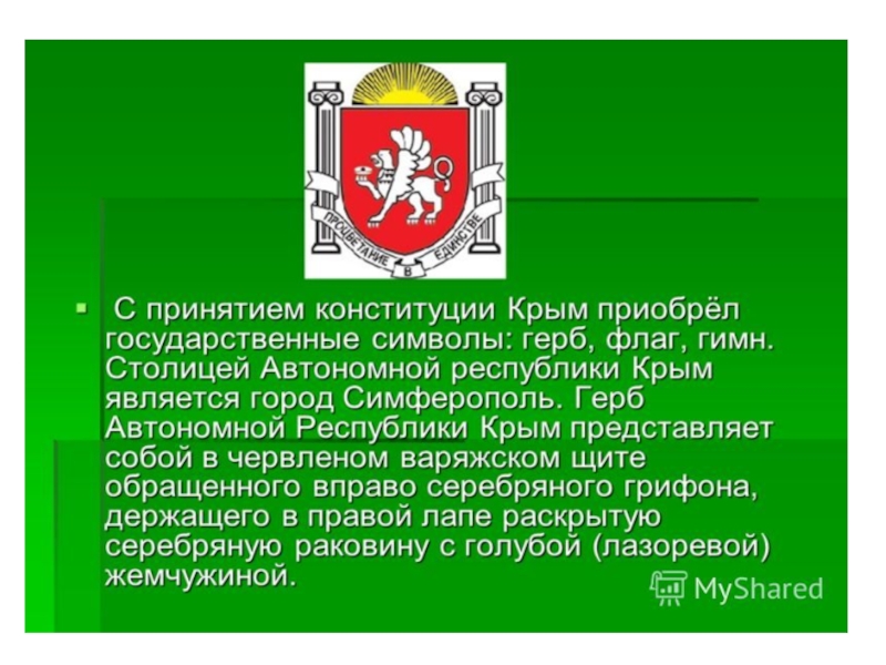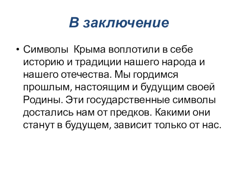 В заключениеСимволы Крыма воплотили в себе историю и традиции нашего народа и нашего отечества. Мы гордимся прошлым,