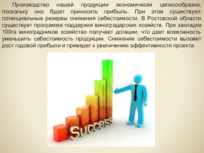 Слайд 29Производство нашей продукции экономически целесообразно, поскольку оно будет приносить прибыль. При