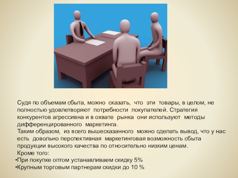 (85–90 % платежеспособных потребителей), что обеспечивается доступностью цены продукта и его высоким качеством. Планом маркетинга предусматривается предоставление 10% скидок для крупно- и мелкооптовых покупателей.