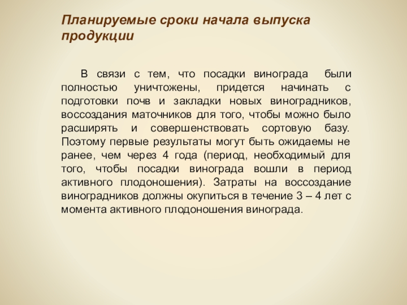 были полностью уничтожены, придется начинать с подготовки почв и закладки новых виноградников, воссоздания маточников для того, чтобы можно было расширять и совершенствовать сортовую базу. Поэтому первые результаты могут быть ожидаемы не ранее, чем через 4 года (период, необходимый для того, чтобы посадки винограда вошли в период активного плодоношения). Затраты на воссоздание виноградников должны окупиться в течение 3 – 4 лет с момента активного плодоношения винограда.