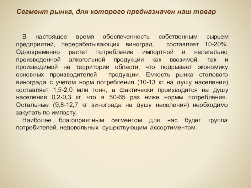 сырьем предприятий, перерабатывающих виноград, составляет 10-20%. Одновременно растет потребление импортной и нелегально произведенной алкогольной продукции как ввозимой, так и производимой на территории области, что подрывает экономику основных производителей продукции. Емкость рынка столового винограда с учетом норм потребления (10-13 кг на душу населения) составляет 1,5-2,0 млн тонн, а фактически производится на душу населения 0,2-0,3 кг, что в 50-65 раз ниже нормы потребления. Остальные (9,8-12,7 кг винограда на душу населения) необходимо закупать по импорту.