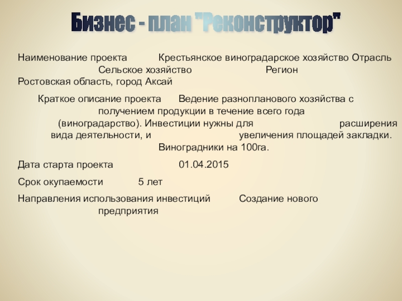 Наименование проекта Крестьянское виноградарское хозяйство Отрасль Сельское хозяйство