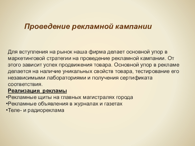 стратегии на проведение рекламной кампании. От этого зависит успех продвижения товара. Основной упор в рекламе делается на наличие уникальных свойств товара, тестирование его независимыми лабораториями и получения сертификата соответствия.
