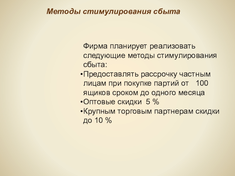 Фирма планирует реализовать следующие методы стимулирования сбыта: