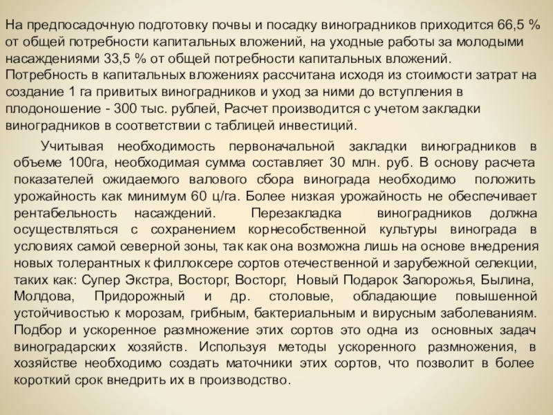 Учитывая необходимость первоначальной закладки виноградников в объеме 100га, необходимая сумма составляет 30 млн. руб. В основу расчета показателей ожидаемого валового сбора винограда необходимо положить урожайность как минимум 60 ц/га. Более низкая урожайность не обеспечивает рентабельность насаждений. Перезакладка виноградников должна осуществляться с сохранением корнесобственной культуры винограда в условиях самой северной зоны, так как она возможна лишь на основе внедрения новых толерантных к филлоксере сортов отечественной и зарубежной селекции, таких как: Супер Экстра, Восторг, Восторг, Новый Подарок Запорожья, Былина, Молдова, Придорожный и др. столовые, обладающие повышенной устойчивостью к морозам, грибным, бактериальным и вирусным заболеваниям. Подбор и ускоренное размножение этих сортов это одна из основных задач виноградарских хозяйств. Используя методы ускоренного размножения, в хозяйстве необходимо создать маточники этих сортов, что позволит в более короткий срок внедрить их в производство.