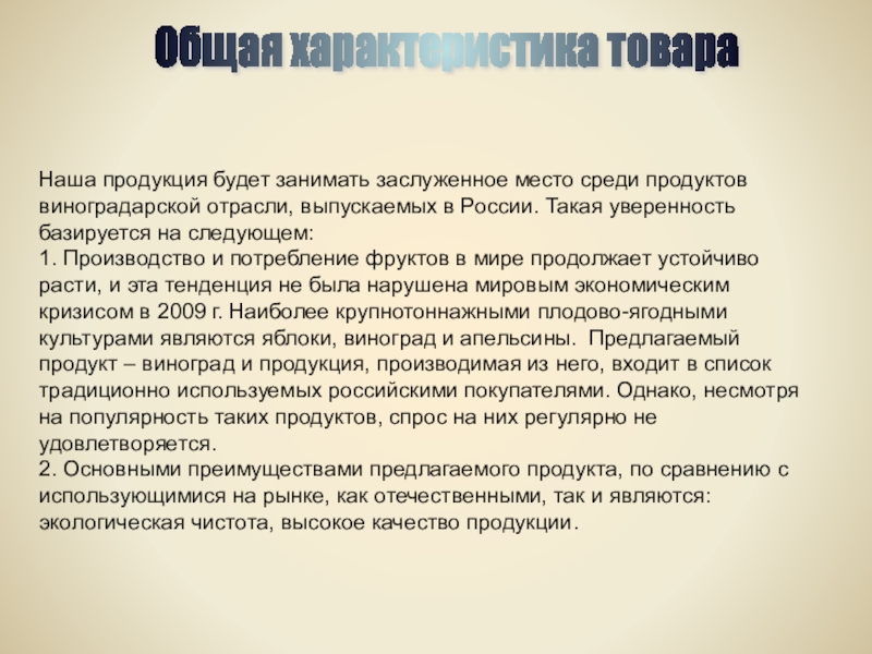 1. Производство и потребление фруктов в мире продолжает устойчиво расти, и эта тенденция не была нарушена мировым экономическим кризисом в 2009 г. Наиболее крупнотоннажными плодово-ягодными культурами являются яблоки, виноград и апельсины. Предлагаемый продукт – виноград и продукция, производимая из него, входит в список традиционно используемых российскими покупателями. Однако, несмотря на популярность таких продуктов, спрос на них регулярно не удовлетворяется.