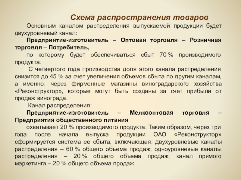 С четвертого года производства доля этого канала распределения снизится до 45 % за счет увеличения объемов сбыта по другим каналам, а именно: через фирменные магазины виноградарского хозяйства «Реконструктор», которые могут быть созданы за счет прибыли от продаж винограда.