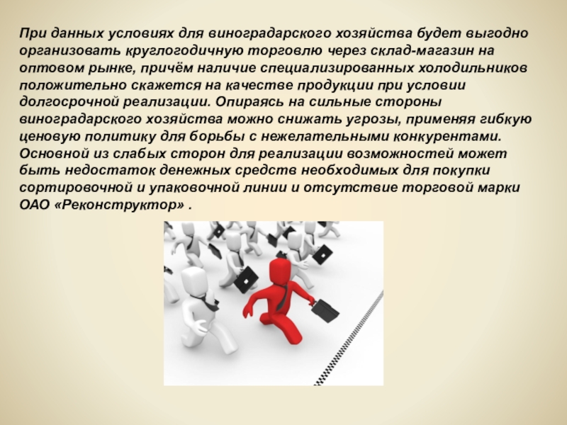 через склад-магазин на оптовом рынке, причём наличие специализированных холодильников положительно скажется на качестве продукции при условии долгосрочной реализации. Опираясь на сильные стороны виноградарского хозяйства можно снижать угрозы, применяя гибкую ценовую политику для борьбы с нежелательными конкурентами. Основной из слабых сторон для реализации возможностей может быть недостаток денежных средств необходимых для покупки сортировочной и упаковочной линии и отсутствие торговой марки ОАО «Реконструктор» .