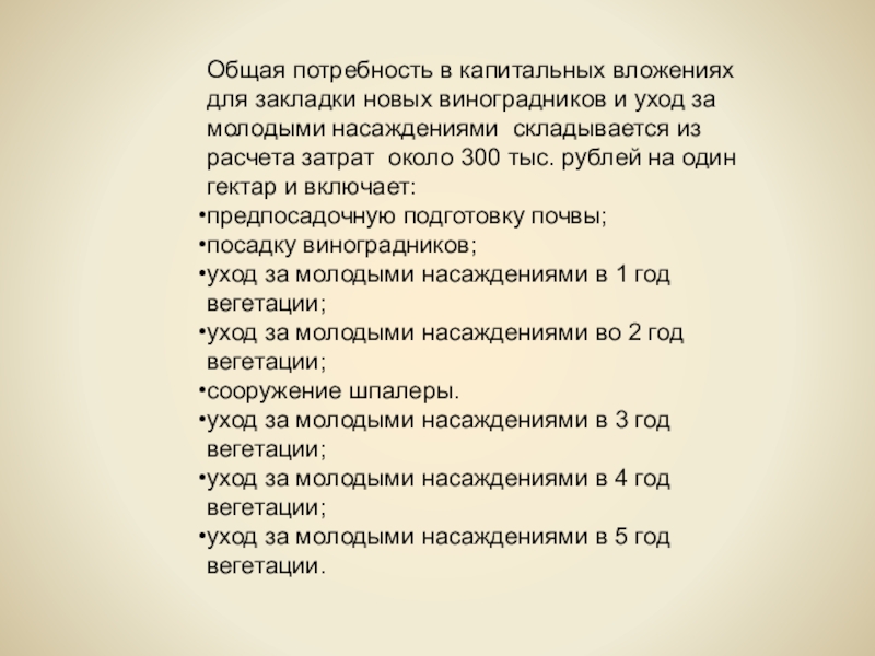 Слайд 21Общая потребность в капитальных вложениях для закладки новых виноградников и уход