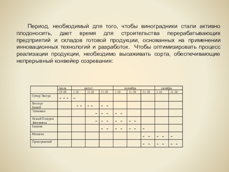 для строительства перерабатывающих предприятий и складов готовой продукции, основанных на применении инновационных технологий и разработок. Чтобы оптимизировать процесс реализации продукции, необходимо высаживать сорта, обеспечивающие непрерывный конвейер созревания: