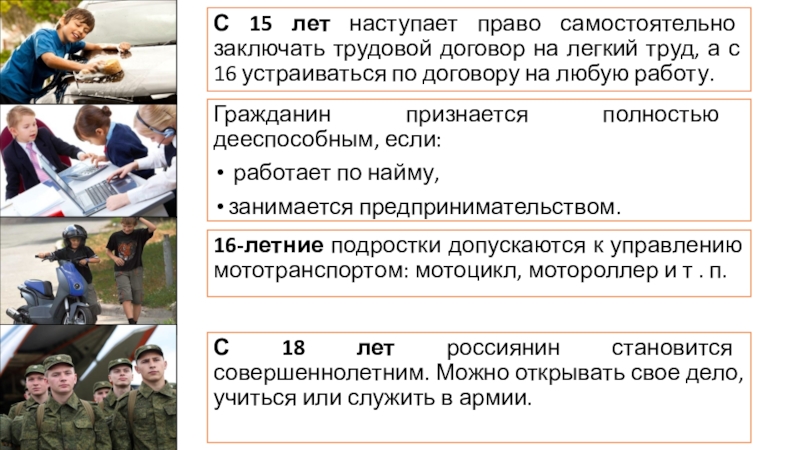 С 18 лет россиянин становится совершеннолетним. Можно открывать свое дело, учиться или служить в армии.