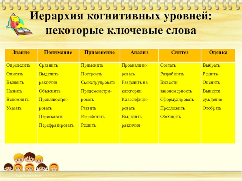 Слайд 6Иерархия когнитивных уровней: некоторые ключевые слова