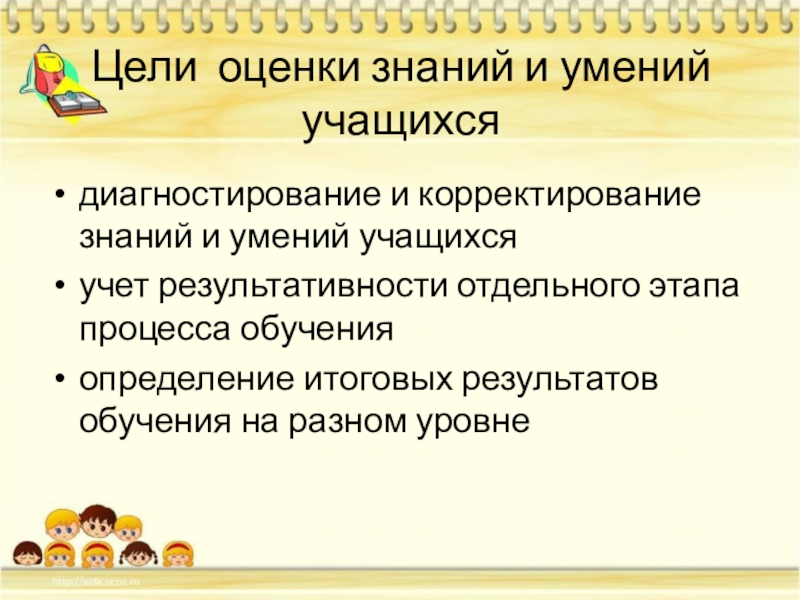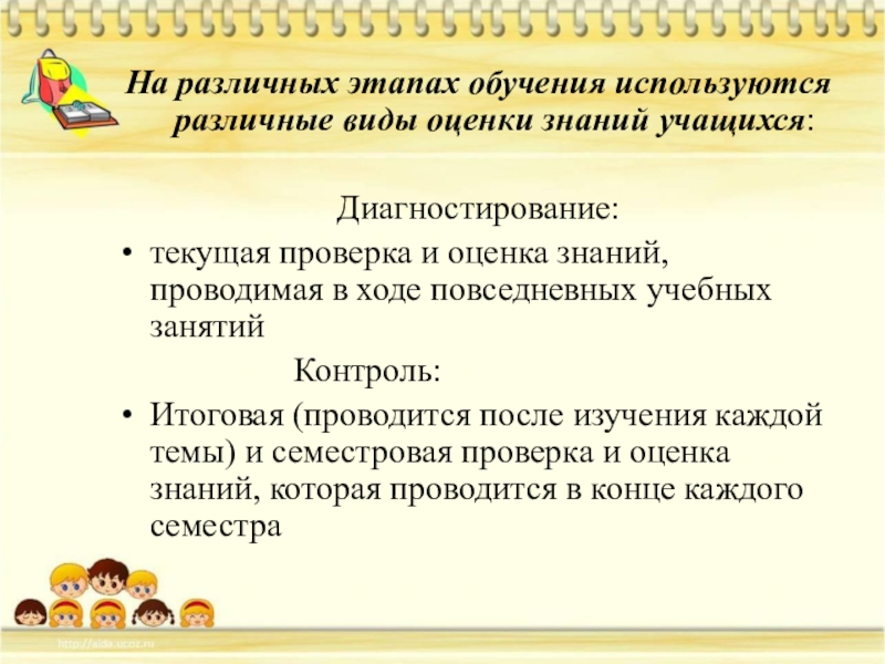 Слайд 23На различных этапах обучения используются различные виды оценки знаний учащихся: