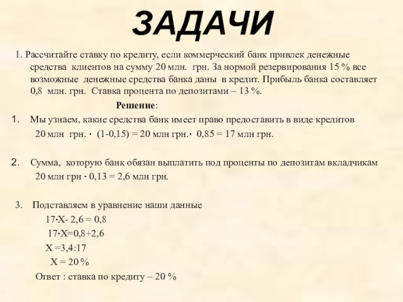 клиентов на сумму 20 млн. грн. За нормой резервирования 15 % все возможные денежные средства банка даны в кредит. Прибыль банка составляет 0,8 млн. грн. Ставка процента по депозитами – 13 %.
