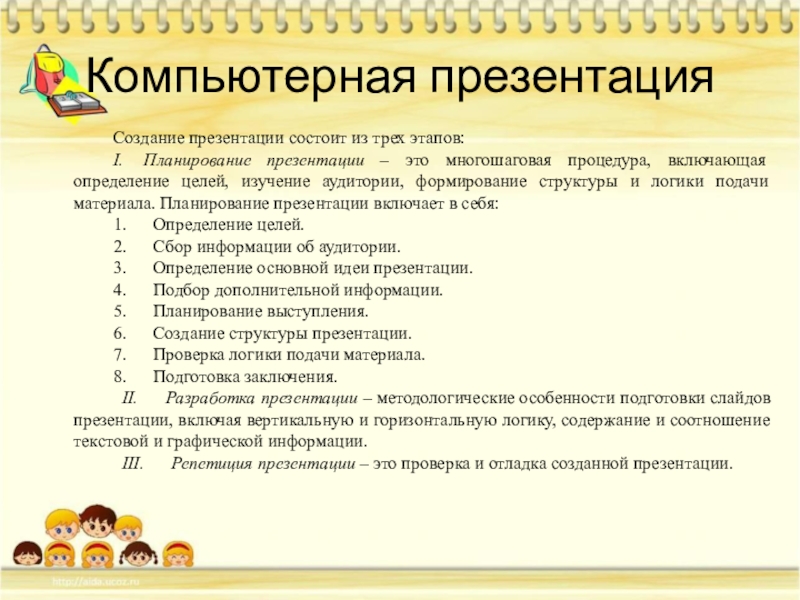 это многошаговая процедура, включающая определение целей, изучение аудитории, формирование структуры и логики подачи материала. Планирование презентации включает в себя: