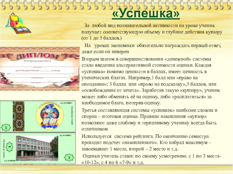 Вторым шагом в совершенствовании «денежной» системы стало введение альтернативной стоимости оценки. Каждая «успешка» помимо ценности в баллах, имеет ценность в ученических благах. Например,1 балл или «право на опоздание»; 3 балла или «право на подсказку»,5 баллов, или «освобождение от зачета». Заработав такую «купюру», ученик может либо обменять её на оценку, либо «расплатиться» за необходимое благо, потеряв оценку.