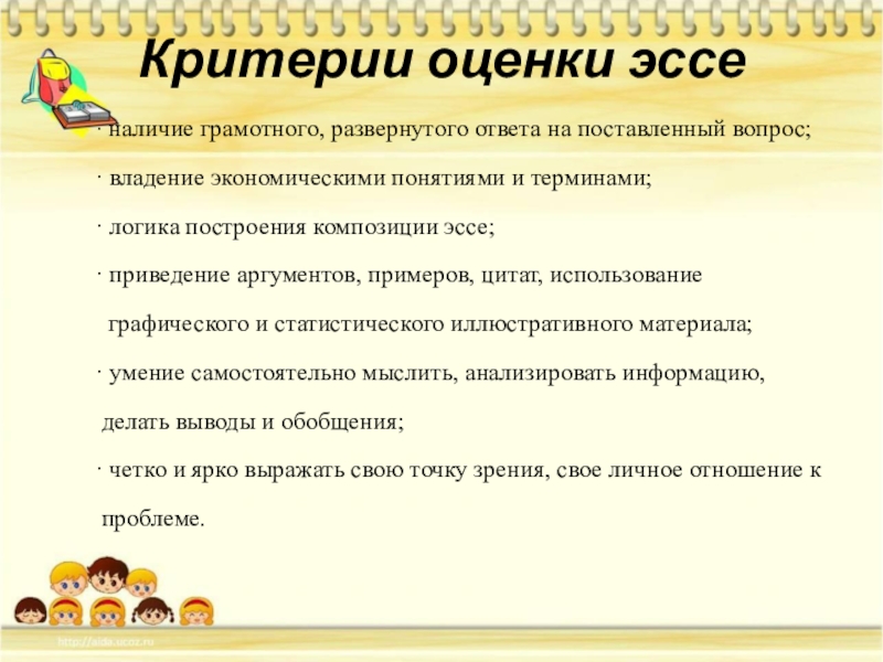 Применение эссе на уроках экономики способствует более четкому и грамотному формулированию мыслей, помогает располагать мысли в строгой логической последовательности, предполагает свободное владение языком экономических терминов и понятий, раскрывает глубину и широту учебного материала, учит использовать примеры, цитаты, необходимые аргументы по соответствующей теме.