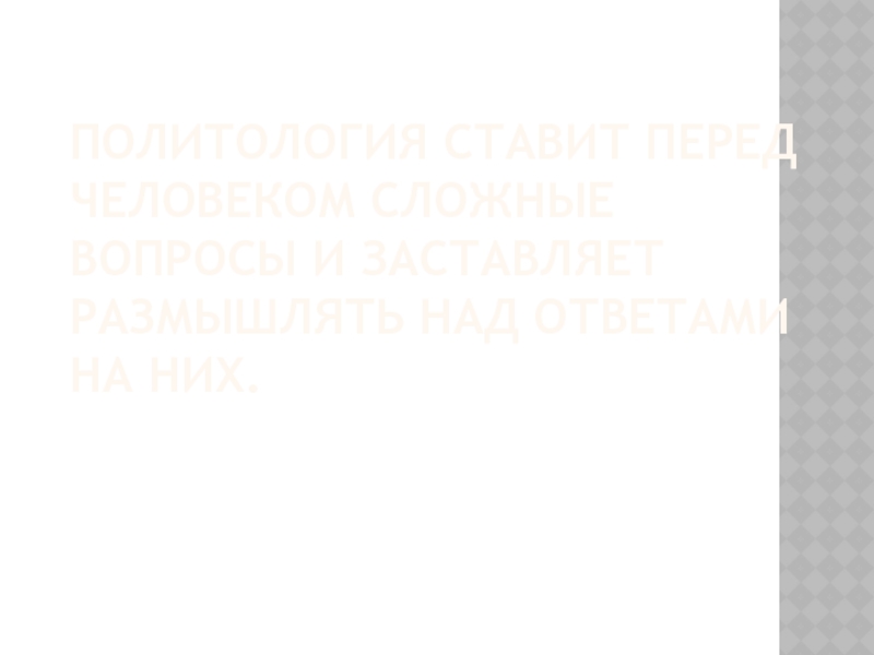 Слайд 8Политология ставит перед человеком сложные вопросы и заставляет размышлять над ответами