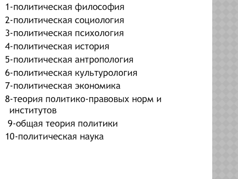 1-политическая философия 2-политическая социология 3-политическая психология 4-политическая история 5-политическая антропология 6-политическая культурология 7-политическая экономика 8-теория политико-правовых