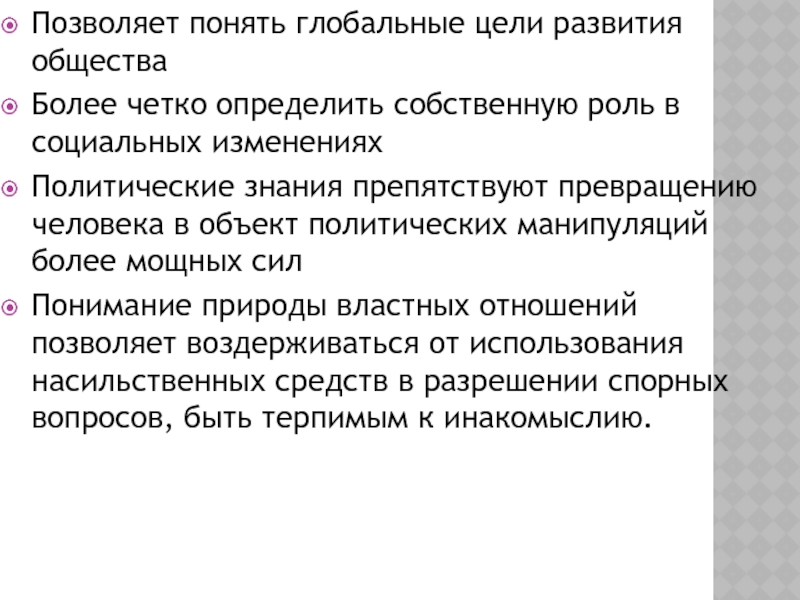 Позволяет понять глобальные цели развития обществаБолее четко определить собственную роль в социальных измененияхПолитические знания препятствуют превращению человека