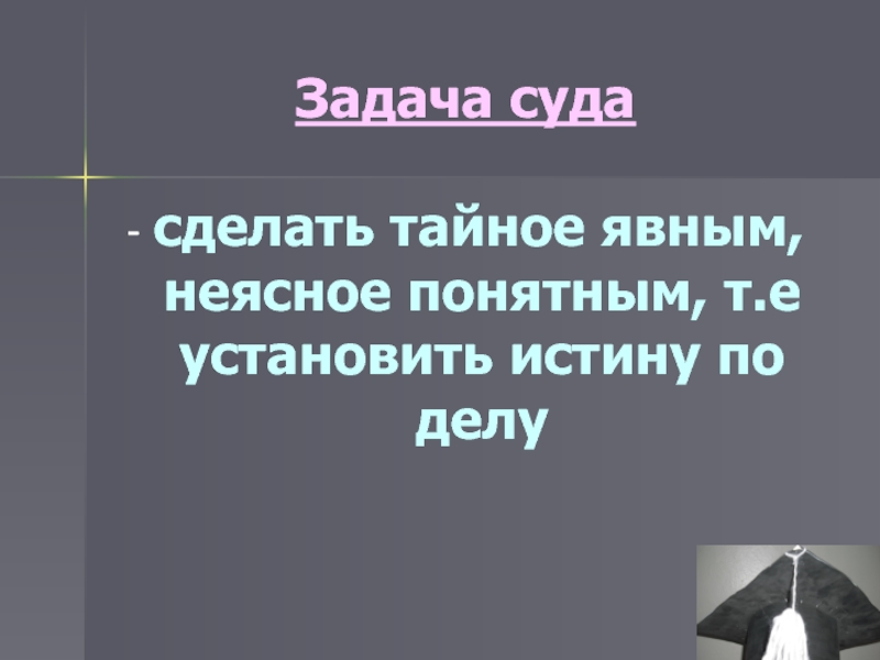 Задача суда- сделать тайное явным, неясное понятным, т.е установить истину по делу