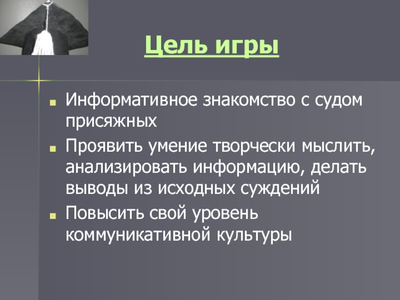 Цель игрыИнформативное знакомство с судом присяжныхПроявить умение творчески мыслить, анализировать информацию, делать выводы из исходных сужденийПовысить свой