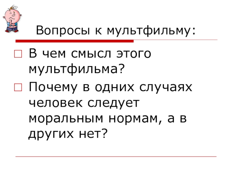 Вопросы к мультфильму:В чем смысл этого мультфильма?Почему в одних случаях человек следует моральным нормам, а в других