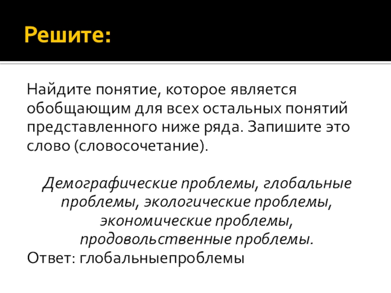 Демографические проблемы, глобальные проблемы, экологические проблемы, экономические проблемы, продовольственные проблемы.