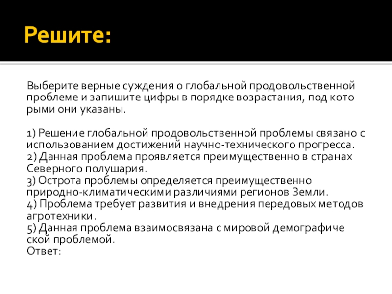Выберите верные суждения о глобальной продовольственной проблеме и запишите цифры в