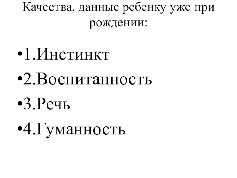 Качества, данные ребенку уже при рождении: 1.Инстинкт2.Воспитанность3.Речь4.Гуманность