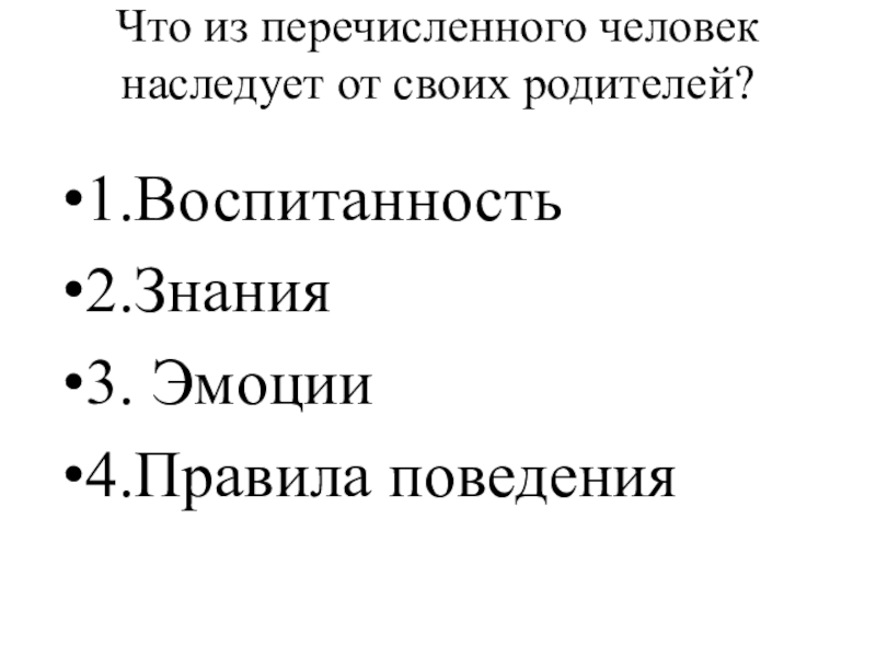 Слайд 4Что из перечисленного человек наследует от своих родителей?