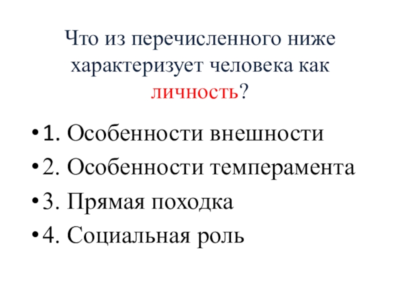 Что из перечисленного ниже характеризует человека как личность?1. Особенности внешности2. Особенности темперамента3. Прямая походка4. Социальная роль