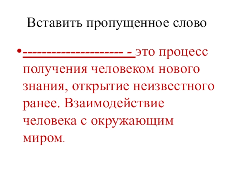 Вставить пропущенное слово--------------------- - это процесс получения человеком нового знания, открытие неизвестного ранее. Взаимодействие человека с окружающим
