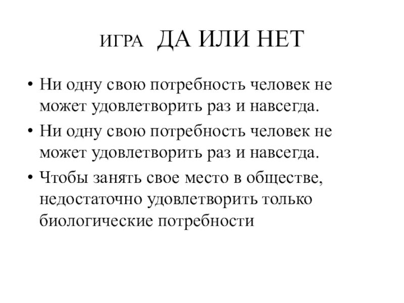 ИГРА  ДА ИЛИ НЕТНи одну свою потребность человек не может удовлетворить раз и навсегда.Ни одну свою