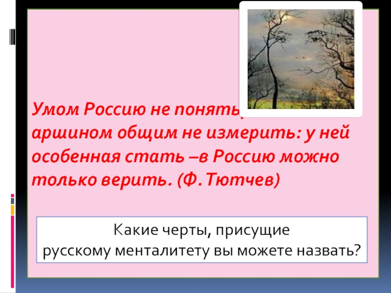 аршином общим не измерить: у ней особенная стать –в Россию можно только верить. (Ф. Тютчев)