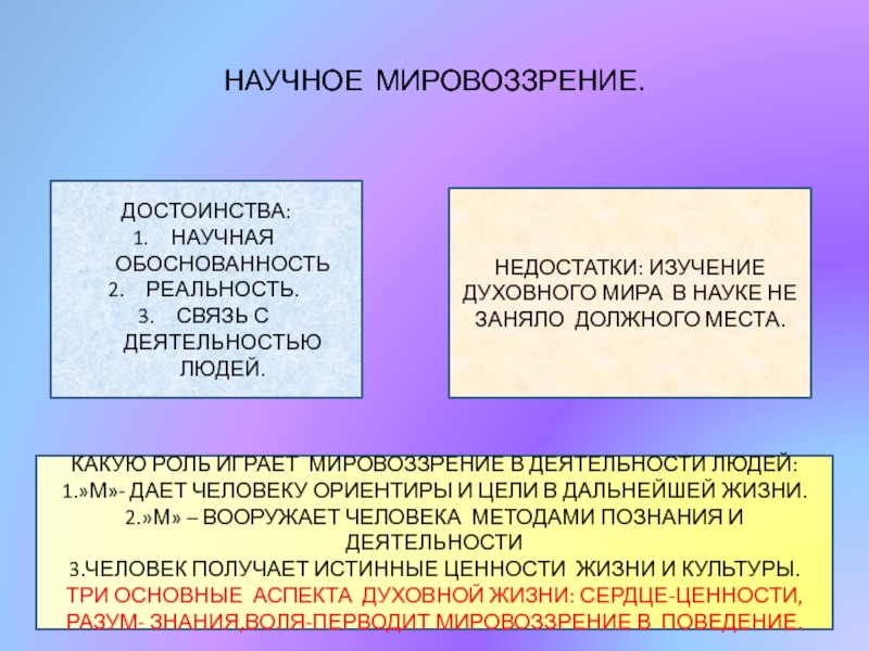 ТРИ ОСНОВНЫЕ АСПЕКТА ДУХОВНОЙ ЖИЗНИ: СЕРДЦЕ-ЦЕННОСТИ, РАЗУМ- ЗНАНИЯ,ВОЛЯ-ПЕРВОДИТ МИРОВОЗЗРЕНИЕ В ПОВЕДЕНИЕ.