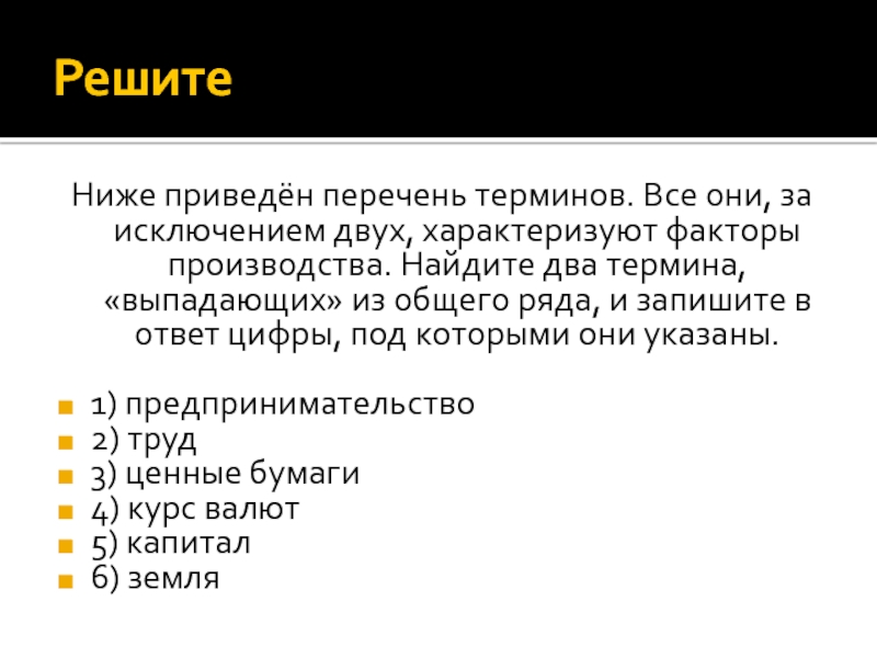 производства. Найдите два термина, «выпадающих» из общего ряда, и запишите в ответ цифры, под которыми они указаны.