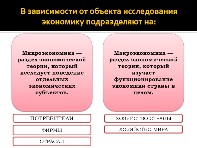 Слайд 10В зависимости от объекта исследования экономику подразделяют на: