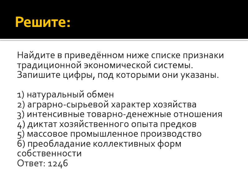 Найдите в приведённом ниже списке признаки традиционной экономической системы. Запишите цифры,