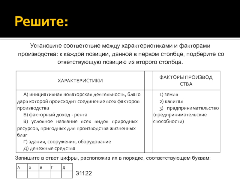 Установите соответствие между характеристиками и факторами производства: к каждой позиции, данной